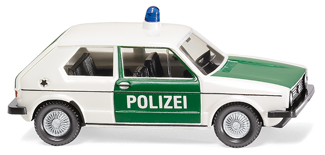 Mit dem ersten Golf endete die Ära des Polizei-Käfers Gleich bei der Premiere des VW Golf I sorgte WIKING vor über vier Jahrzehnten für einen hoheitlichen Auftritt – damals freilich in den minzgrünen Farben der Bereitschaftspolizei. Jetzt feiert die erste Golf-Generation in der typischen zweifarbigen Polizeigestaltung Premiere, denn die beweglichen Türen, Motorhaube und Heckklappe waren einst auf der weißen Karosserie minzgrün abgesetzt. So komplettieren die Traditionsmodellbauer die Serie von Polizeifahrzeugen aus nunmehr sieben Jahrzehnten Nachkriegsgeschichte. VW schrieb mit dem Wolfsburger Kompaktwagen Automobilgeschichte, denn diese Golf-Klasse überzeugte lange Jahre mit mehr Raum und im Vergleich zum Käfervorfahren mit deutlich mehr Nutzwert. Einige Bundesländer lösten den legendären Polizei-Käfer durch den Golf I ab. Karosserie weiß mit minzgrünen Türen, Motorhaube und Heckklappe bedruckt, weißer Sockel mit blautransparentem Warnlicht dachmittig eingesteckt. Schwarze Inneneinrichtung und schwarzer Kühlergrill mit gesilberten VW-Logo. Handbemalte Frontscheinwerfer sowie gesilberte Riffelradkappen. Seitliche Bedruckung mit schwarzen Zierstreifen sowie Türgriffen, Tankdeckel und Kotflügelschutz. Polizei-Schriftzug weiß bedruckt. Heckseitig silberner Volkswagen-Schriftzug sowie Türschloss und Schriftzug Golf L. Rückleuchten rot bedruck.